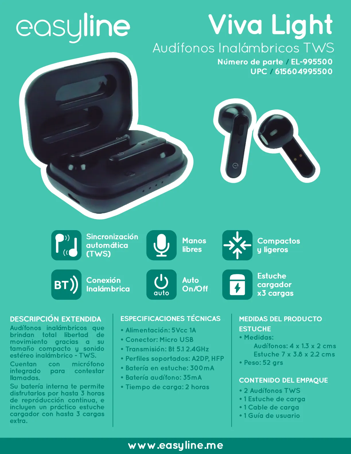 Audífonos EASY LINE Viva Light / Con Micrófono / Inalámbricos / Bluetooth / Color Negro