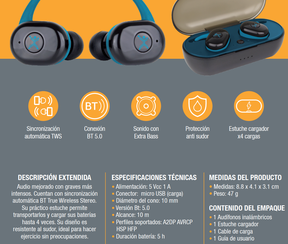 Audio mejorado con graves más intensos. Cuentan con sincronización automática BT True Wireless Stereo. Su práctico estuche permite transportarlos y cargar sus baterías hasta 4 veces. Su diseño es resistente al sudor, ideal para hacer ejercicio sin preocupaciones.