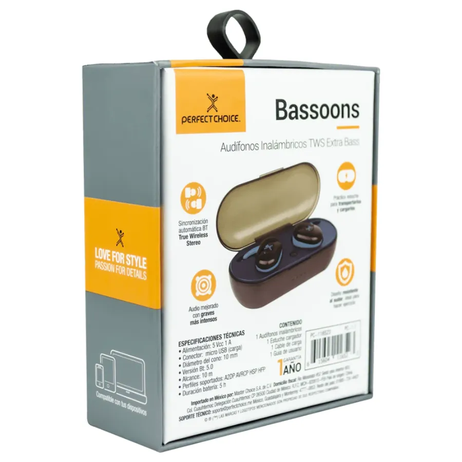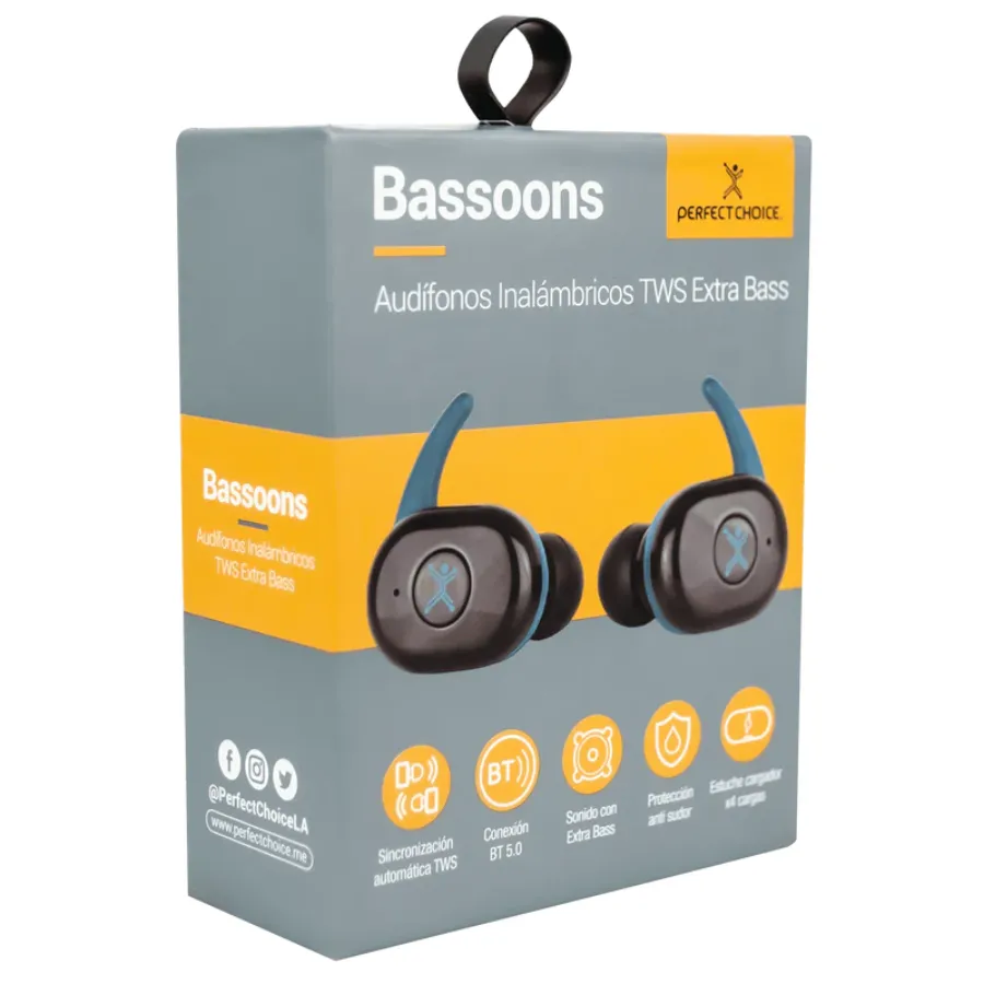 Audífonos PERFECT CHOICE Bassons / Inalámbrico / Bluetooth / Extra Bass / Estuche Cargador / Negro / PC-116523