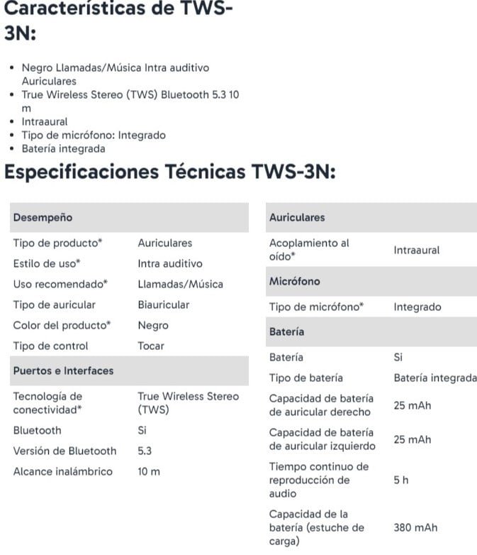 • Los Audífonos Intrauriculares TWS-3N en color negro cuentan con micrófono integrado y estilo de uso intra auditivo. Tienen un tipo de control táctil y una capacidad de batería de 25 mAh en cada auricular. La reproducción de audio continuo es de 5 horas y utilizan la tecnología de conectividad True Wireless Stereo (TWS) con Bluetooth 5.3. Recomendados para llamadas y música, los auriculares son biauriculares e incluyen una batería integrada con una capacidad de 380 mAh en el estuche de carga. Con un alcance inalámbrico de 10 metros, son ideales para disfrutar de una experiencia auditiva inalámbrica sin interrupciones.