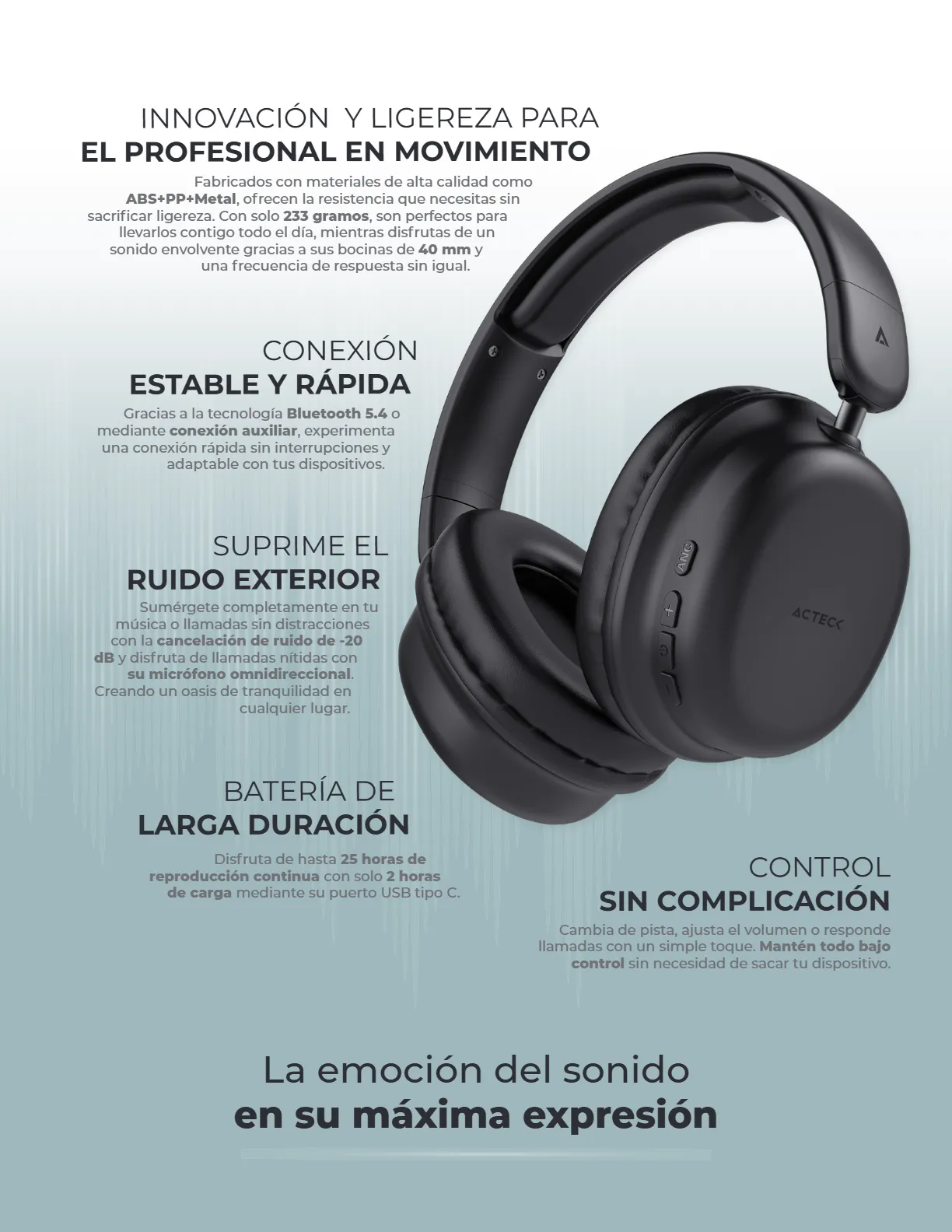 Diadema ACTECK HONOUR 2 Plus HP626 – Inalámbrico – Alámbrico, Bluetooth 5.4 – 3.5mm, Carga USB-C, Con Micrófono, Cancelación De Ruido- Negro