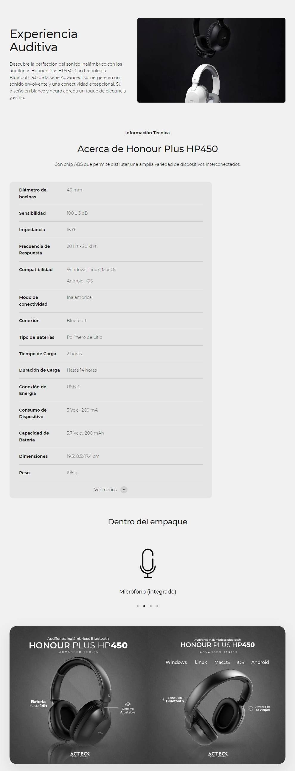 Sé el primero en valorar “Diadema ACTECK Honour Plus HP450 / Inalámbrico / Bluetooth / Conexión De Energía USB-C / Con Micrófono Integrado / Hasta 14 Horas / Blanco Con Gris”