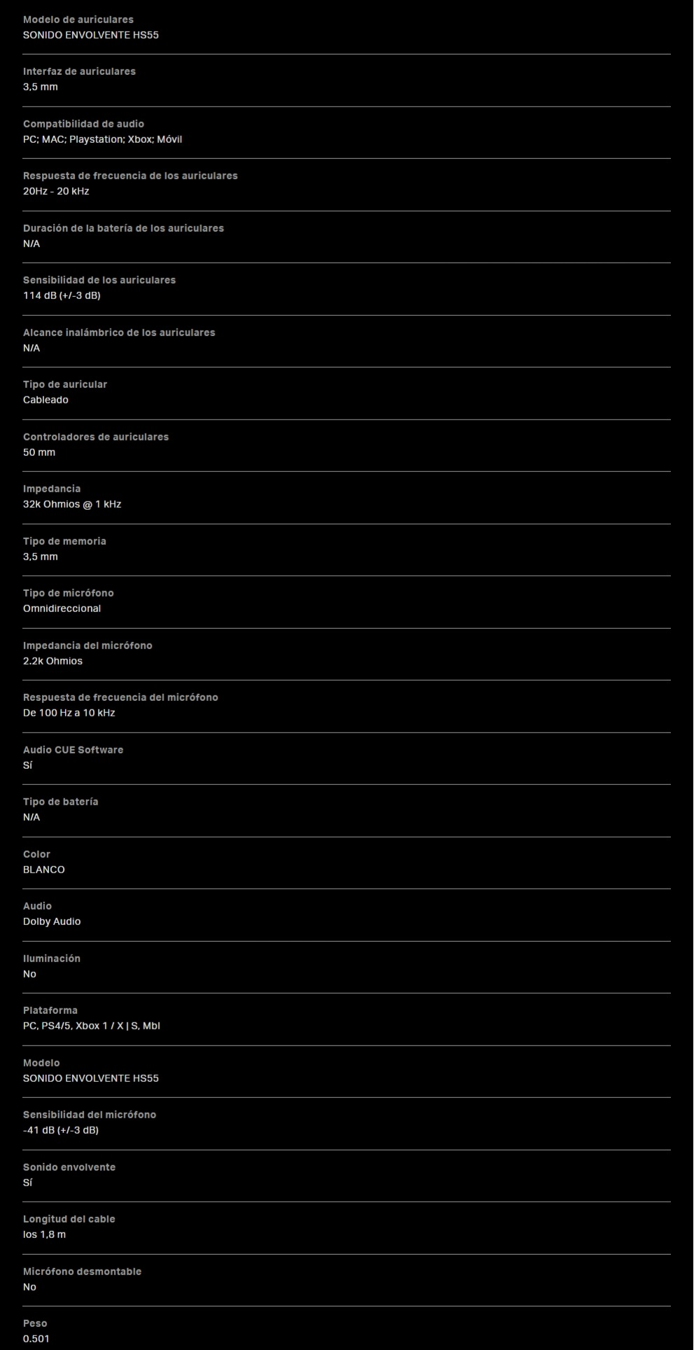 Diadema CORSAIR HS55 SURROUND / Alámbrico 1.8metros / Dolby Audio 7.1 / 3.5mm, USB / PC, PS4/5, Xbox / Blanco