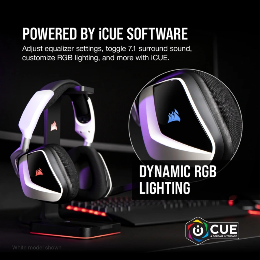 Sumérjase en la acción con los CORSAIR VOID RGB ELITE Wireless, con transductores de audio de neodimio de 50 mm de ajuste personalizado, un cómodo tejido de rejilla de microfibra con almohadillas de espuma con memoria y una conexión inalámbrica de 2,4 GHz.
