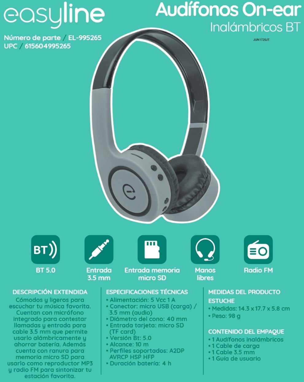 ![[615604995265] AUDIFONOS EASY LINE ON-EAR EL-995265 GRIS BLUETOOTH 1M DE GARANTIA Diadema EASY LINE ON-EAR / Micrófono / Inalámbrico / Bluetooth 5.0 / Micro USB / 3.5 mm / Radio FM / Entrada Memoria Micro SD / Gris - Image 1](https://eafa3974.delivery.rocketcdn.me/wp-content/uploads/2024/10/615604995265-AUDIFONOS-EASY-LINE-ON-EAR-EL-995265-GRIS-BLUETOOTH-1M-DE-GARANTIA.webp)
