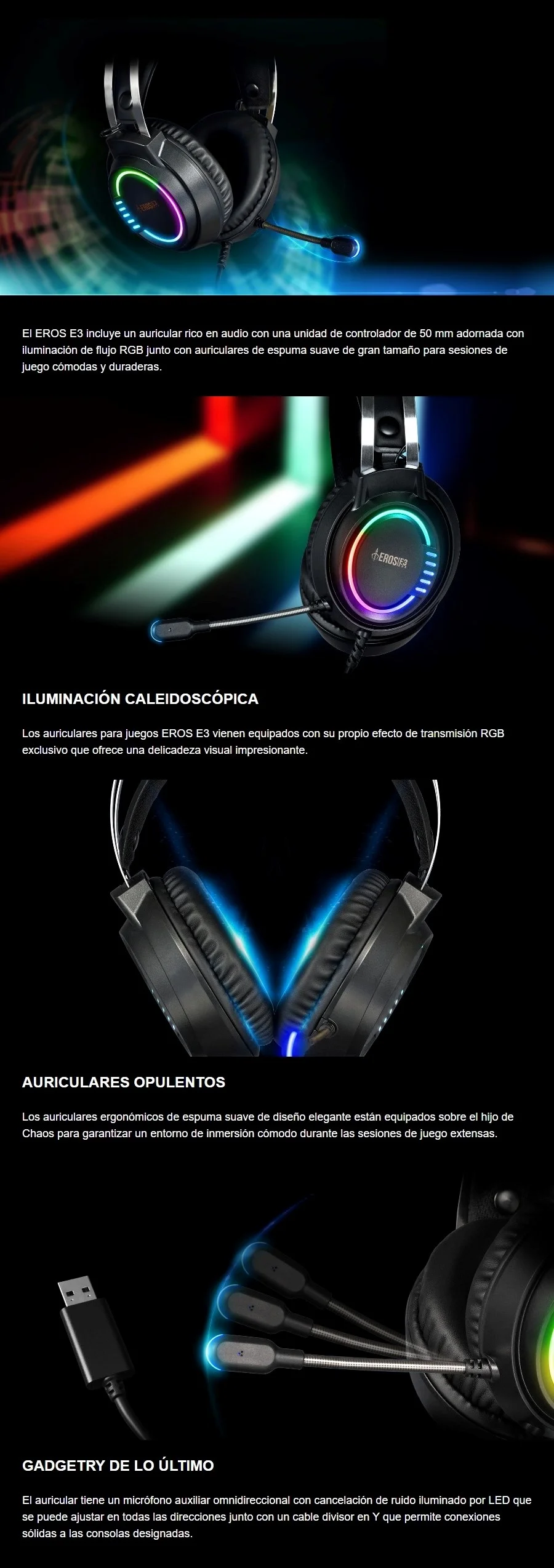 Diadema Gaming Gamdias EROS E3 / Estéreo / Alámbrico / 3.5 Mm, Usb / Micrófono Omnidireccional / RGB / 1.8 m / Negro