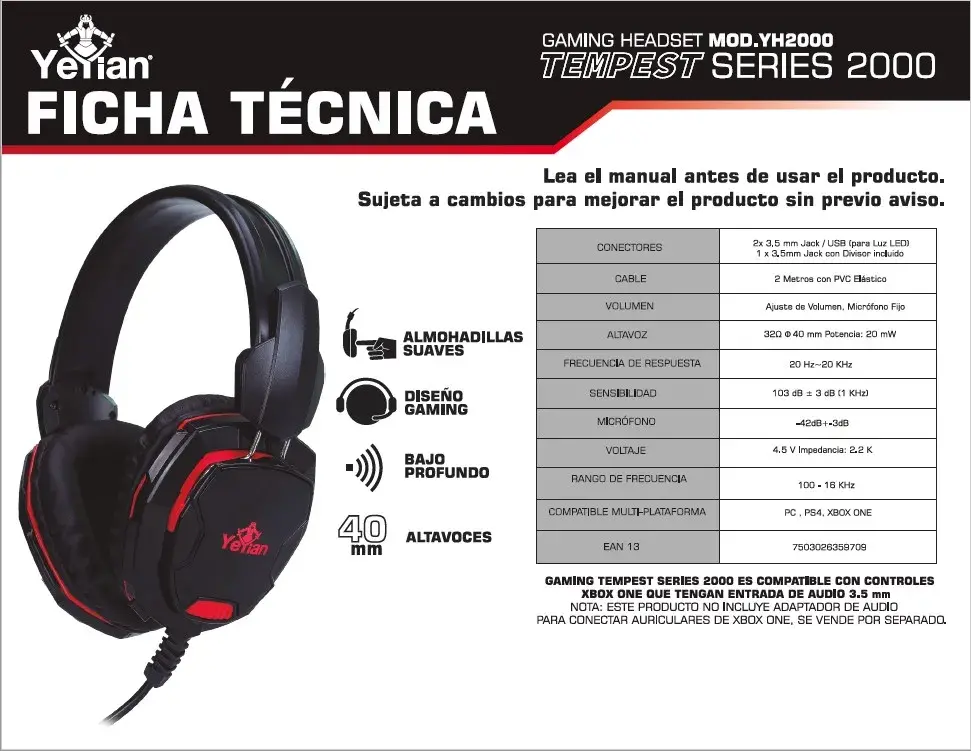 Diadema Headset GAMER YEYIAN TEMPEST 2000 / HI-FI / 3.5MM / Micrófono / USB Solo Para Led / Control De Volumen / Negro Con Rojo