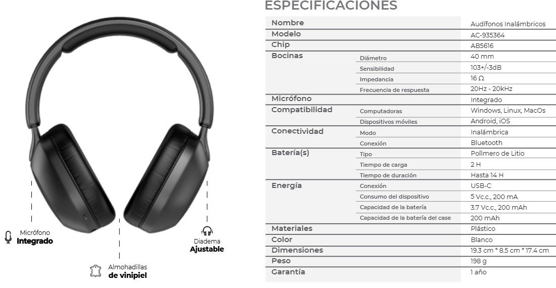 Diadema Inalámbrica ACTECK HONOUR PLUS HP450 / Micrófono / Inalámbrico / Manos Libres / 3.5mm / Over-Ear / Negro