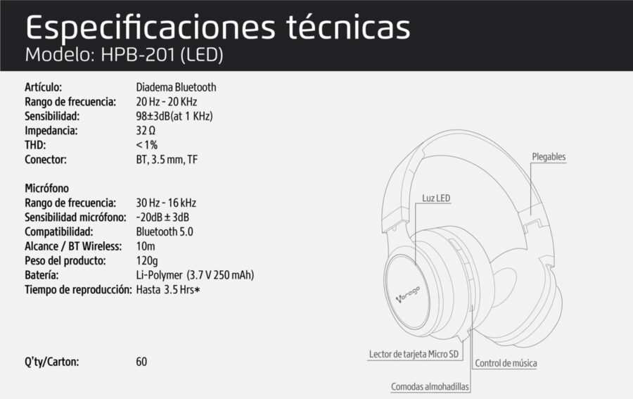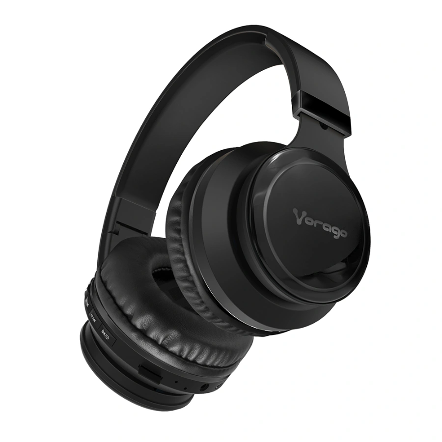 Diadema Inalámbrica VORAGO HPB-201-LED / Estéreo / Con Micrófono / Bluetooth 5.0, Micro SD / 3.5 MM / Iluminación LED / Recargable / Plegables / Color Negro