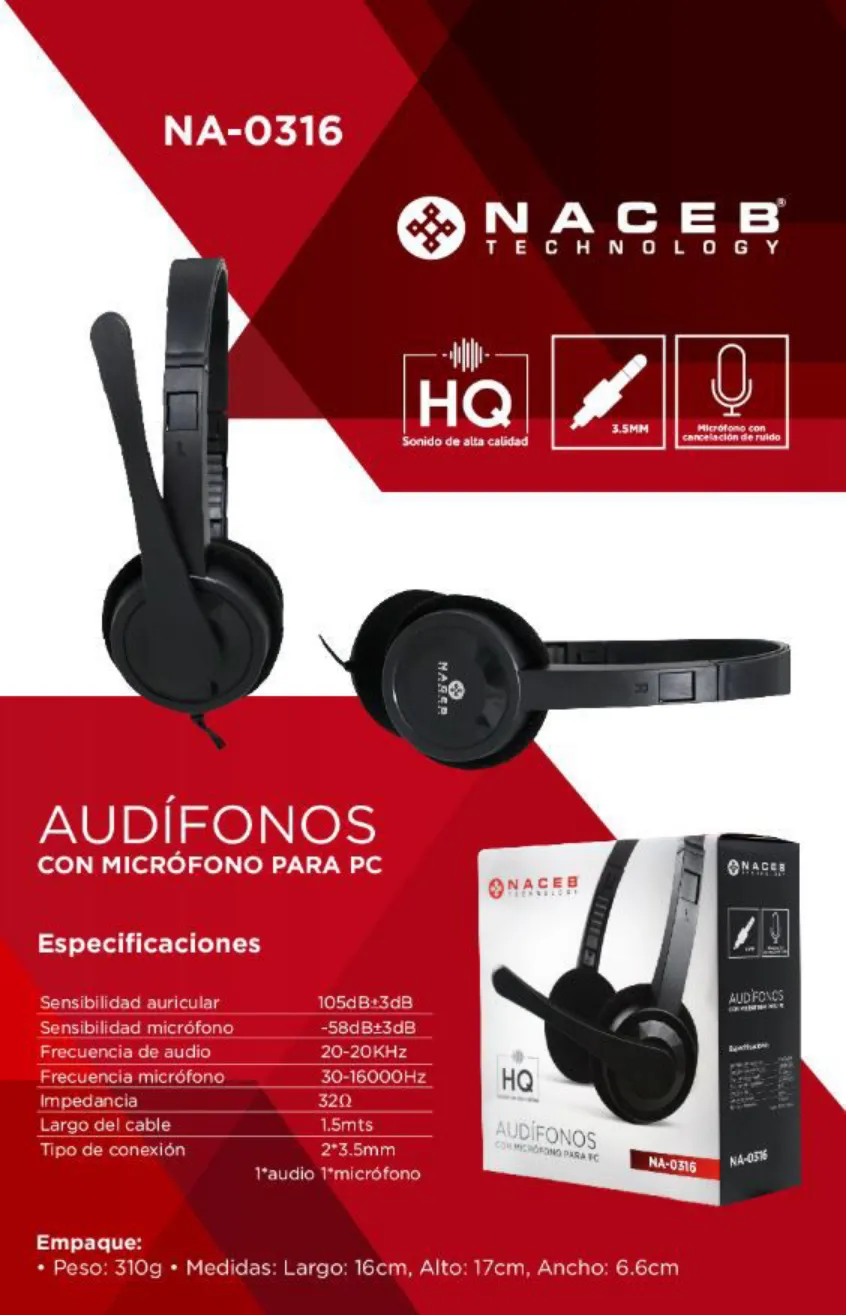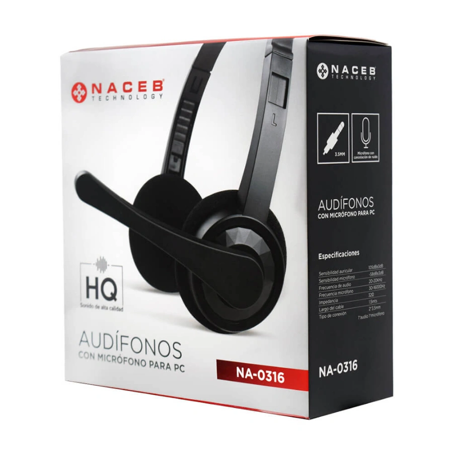 Diadema Naceb Na-0316 / 1.5 Metros / Alámbrico / Con Microfono Para Pc / Conectores 2 / 3.5MM / Negro