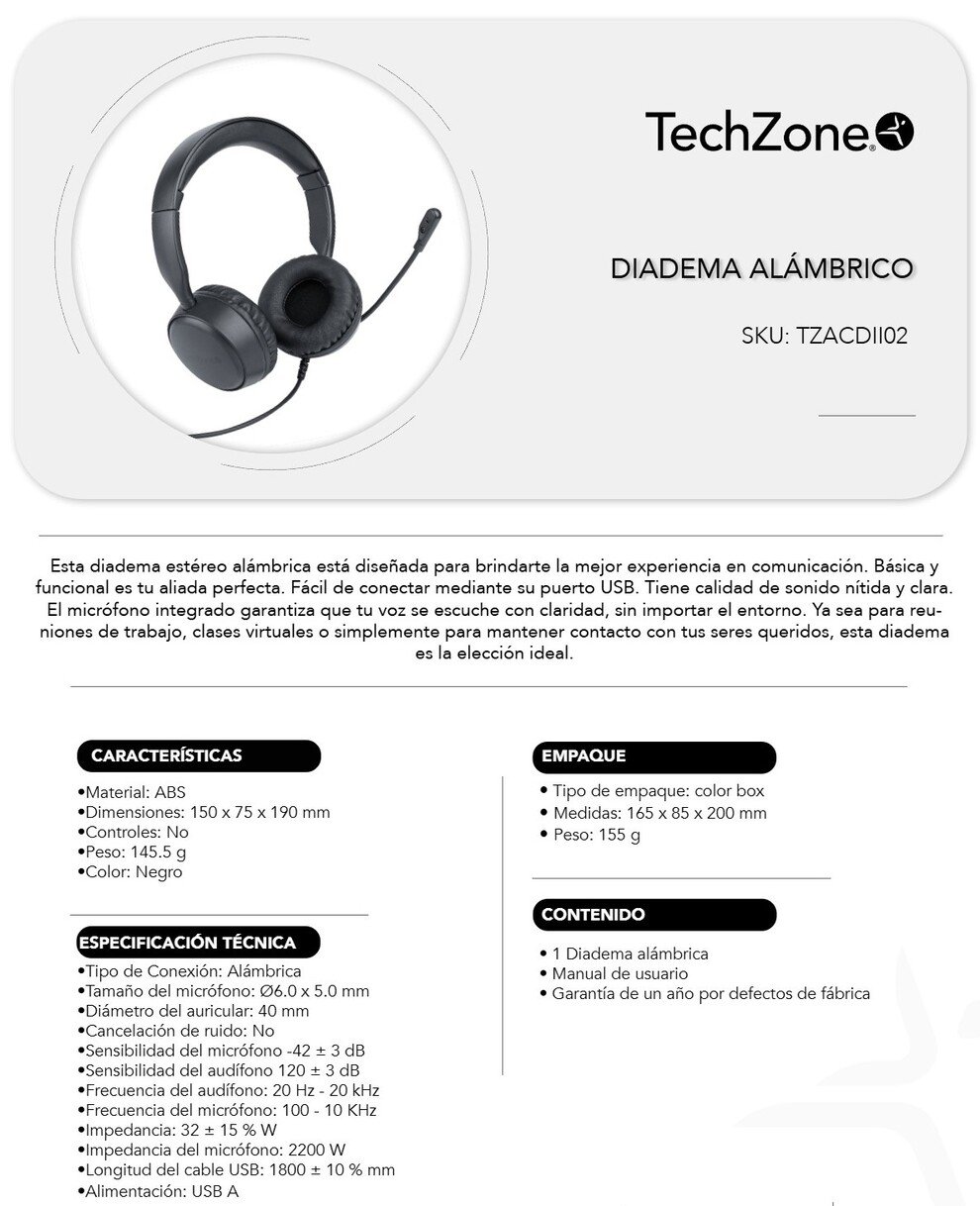 Diadema TECHZONE TZACDII02 / Micrófono / Alámbrico / USB / Micrófono Retráctil / Cable 1.8 M / Color Negro