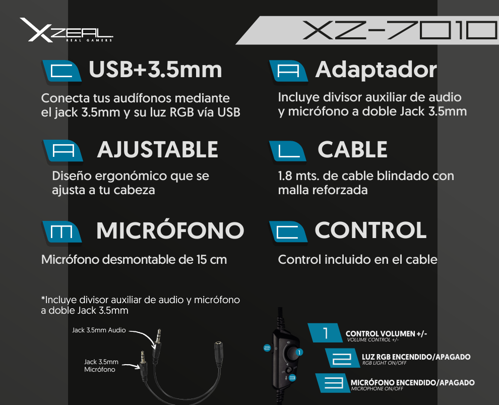 Diadema XZEAL XZ-7010 RGB / Alámbrico / 3.5mm / Micrófono Desmontable / Cancelación De Ruido / Para PC, Mac, PlayStation, Xbox, Android / Negro