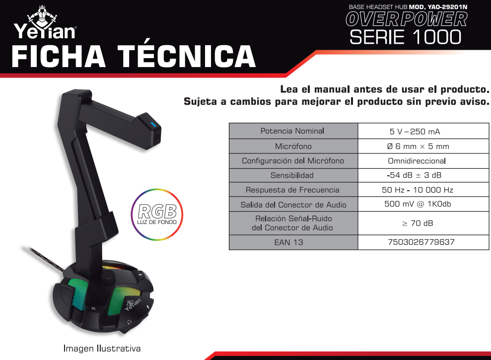 Base Para Audifonos + Hub YEYIAN Overpower Serie 1000 RGB / Audio / Microfono / Conector Usb