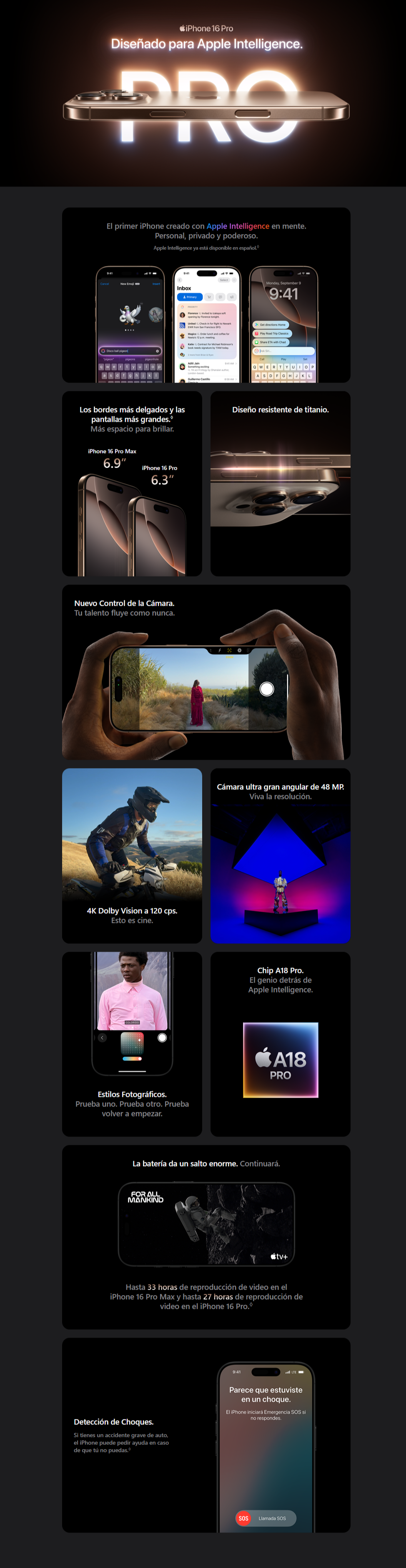 El primer iPhone diseñado con Apple Intelligence en mente. El iPhone 16 Pro tiene un sofisticado diseño de titanio grado 5 con un nuevo acabado microarenado.