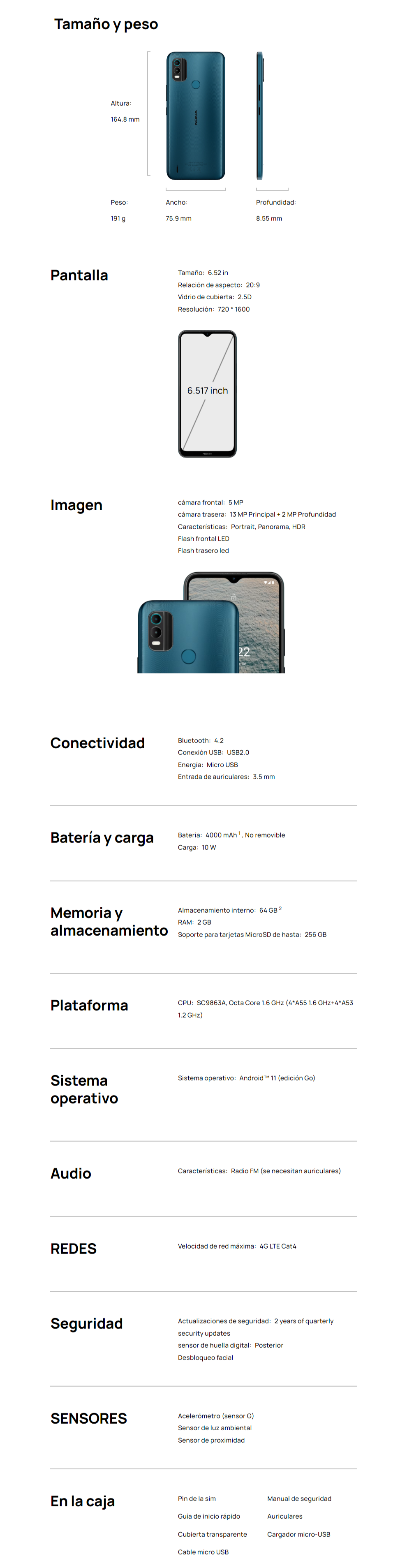 Smartphone NOKIA C21 PLUS / 6.51″ / Octa-Core / Almacenamiento 64GB / Ram 2GB / Cámara 13MP+2MP/5MP / Android 11 / Desbloqueo facial / Huella / Cian Oscuro