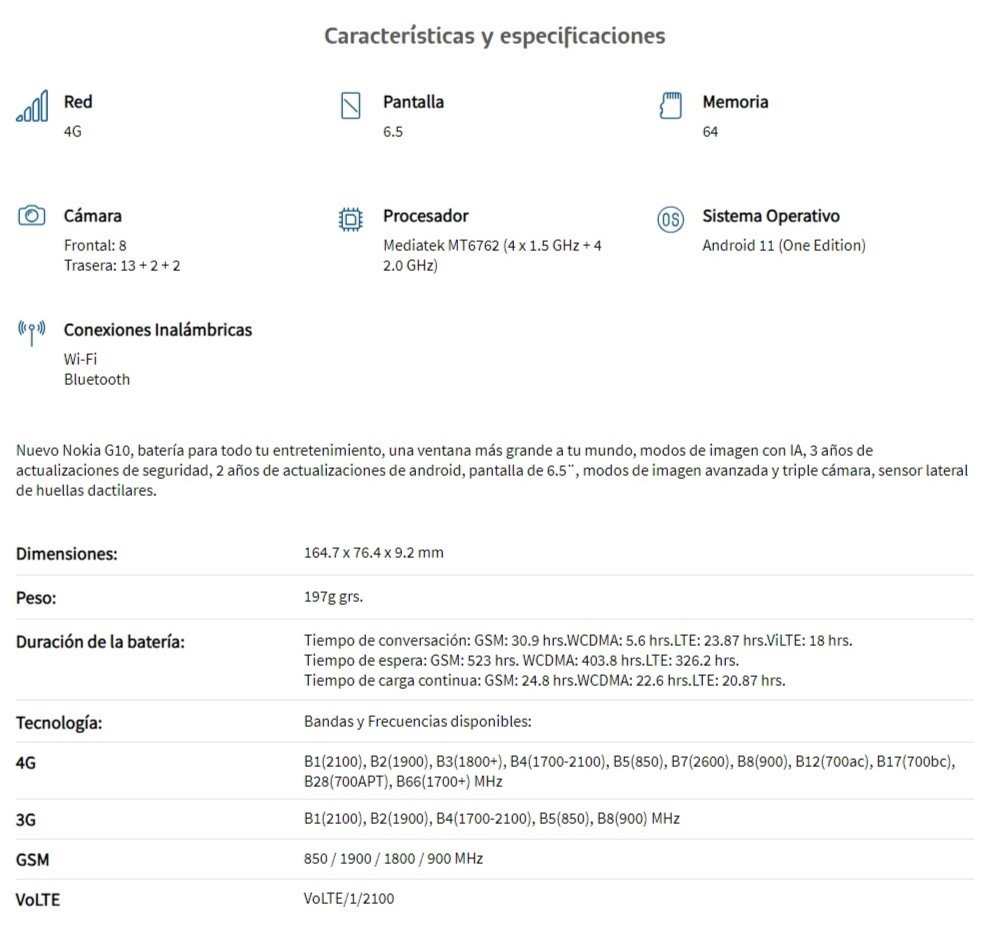 Smartphone NOKIA G10 / Octa-Core 2.0 GHz / 6.5″ / 3GB RAM / 64GB Almacenamiento / Cámara 13MP+2MP+2MP/8MP / Android 11 / Bluetooth 5.3 / Azul
