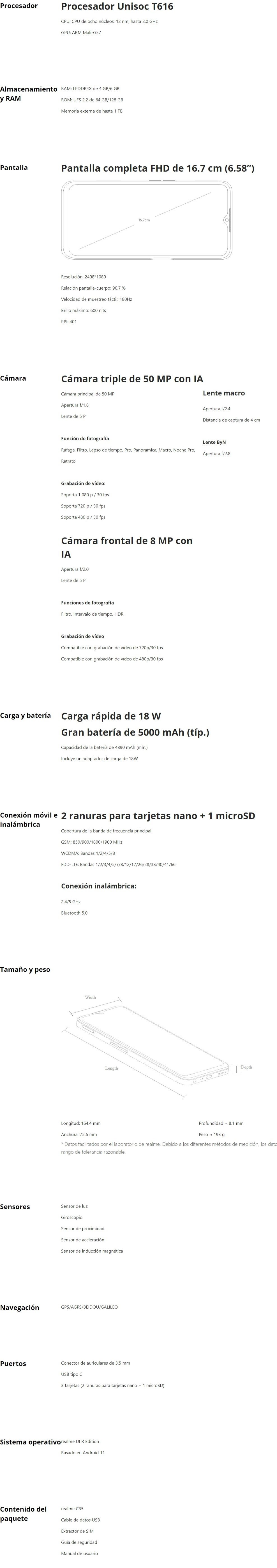 Smartphone REALME C35 / Unisoc T616 / 6.58″ / 4GB RAM / 128GB Almacenamiento / Cámara 50MP+2MP/8MP / Android 11 / Color Negro
