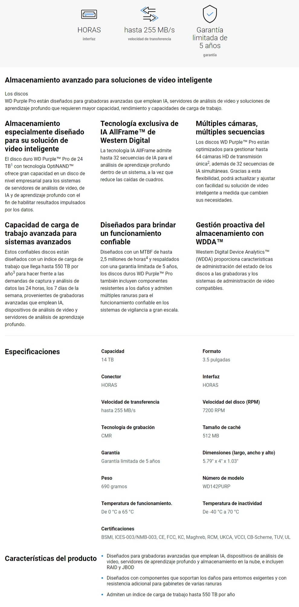 Disco Duro Para Vigilancia WESTERN DIGITAL WD PURPLE PRO / 14TB / 3.5” / SATA 6 Gbit/S / 7200 Rpm / 512 Mb Caché / 255MB/s