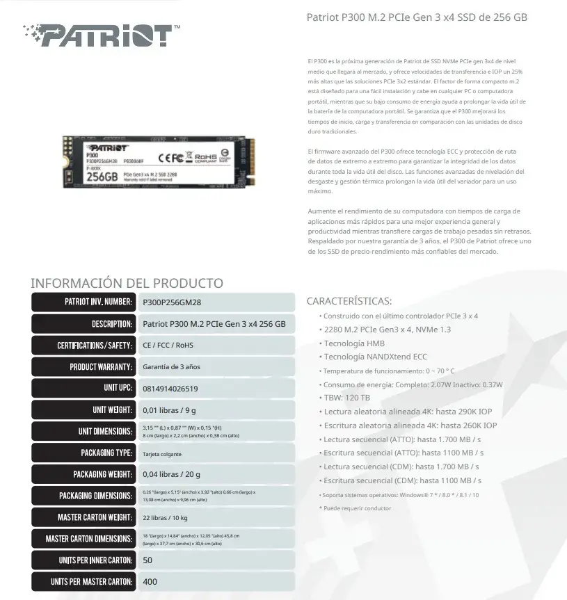Nvme Patriot P300 256GB / M.2 2280 / Pcie Gen 3 X4 / Tecnología Ecc Nandxtend / Lectura 1700MB/S, Escritura 1100MB/S
