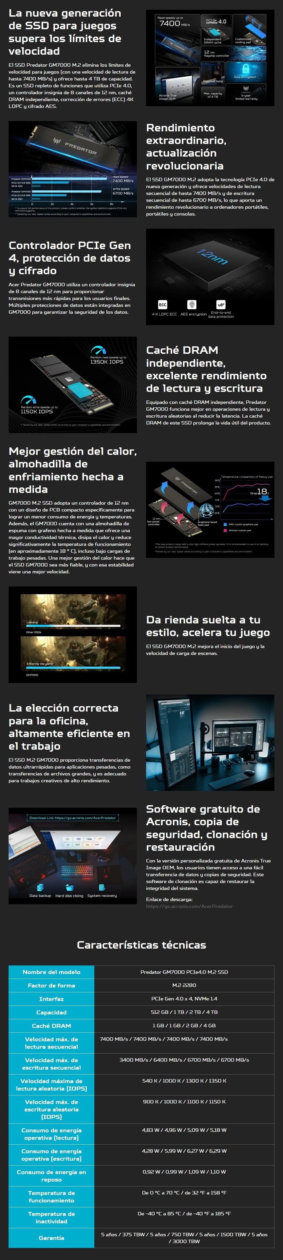 Unidad de Estado Sólido NVMe SSD Acer Predator GM-7000 – 4TB, M.2 2280, PCI Express 4.0, Lectura 7400Mb/S*, Escritura 6700Mb/S*