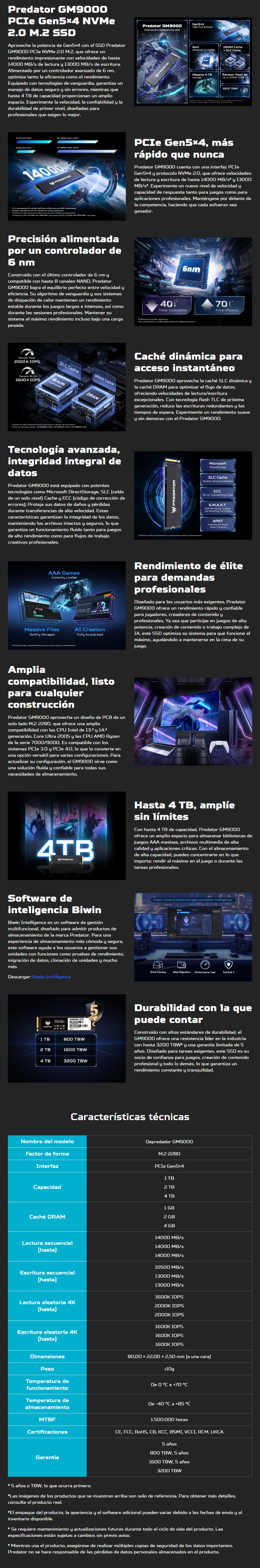 Unidad De Estado Solido SSD M.2 NVME PREDATOR GM9000 – 4TB, 22.80, PCIE 5.0, Lectura 14000 MB/S, Escritura 13000 Mb/S