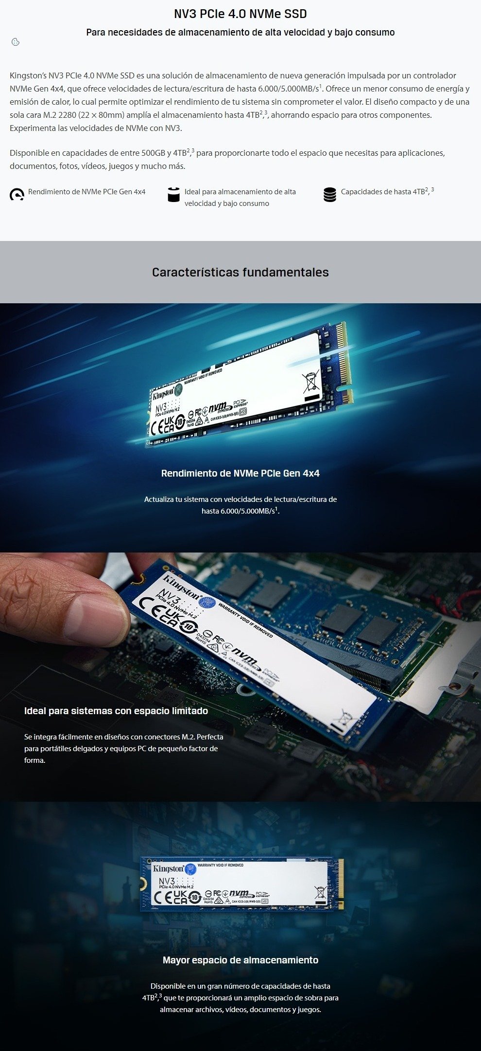 • Kingston’s NV3 PCIe 4.0 NVMe SSD es una solución de almacenamiento de nueva generación impulsada por un controlador NVMe Gen 4×4, que ofrece velocidades de lectura/escritura de hasta 6.000/5.000MB/s.