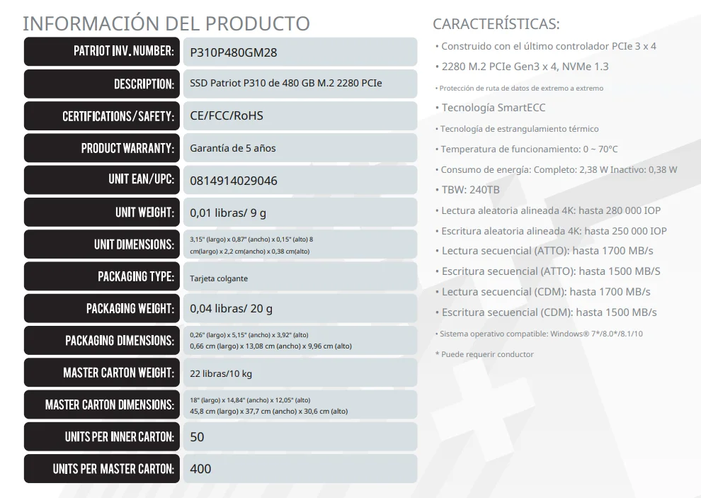 Sé el primero en valorar “Unidad SSD M.2 NVME Patriot 480GB P310 / Pcie 3.0 / 2280 / 1.3 / Lectura 1700MB/s / Escritura 1500 MB/s”