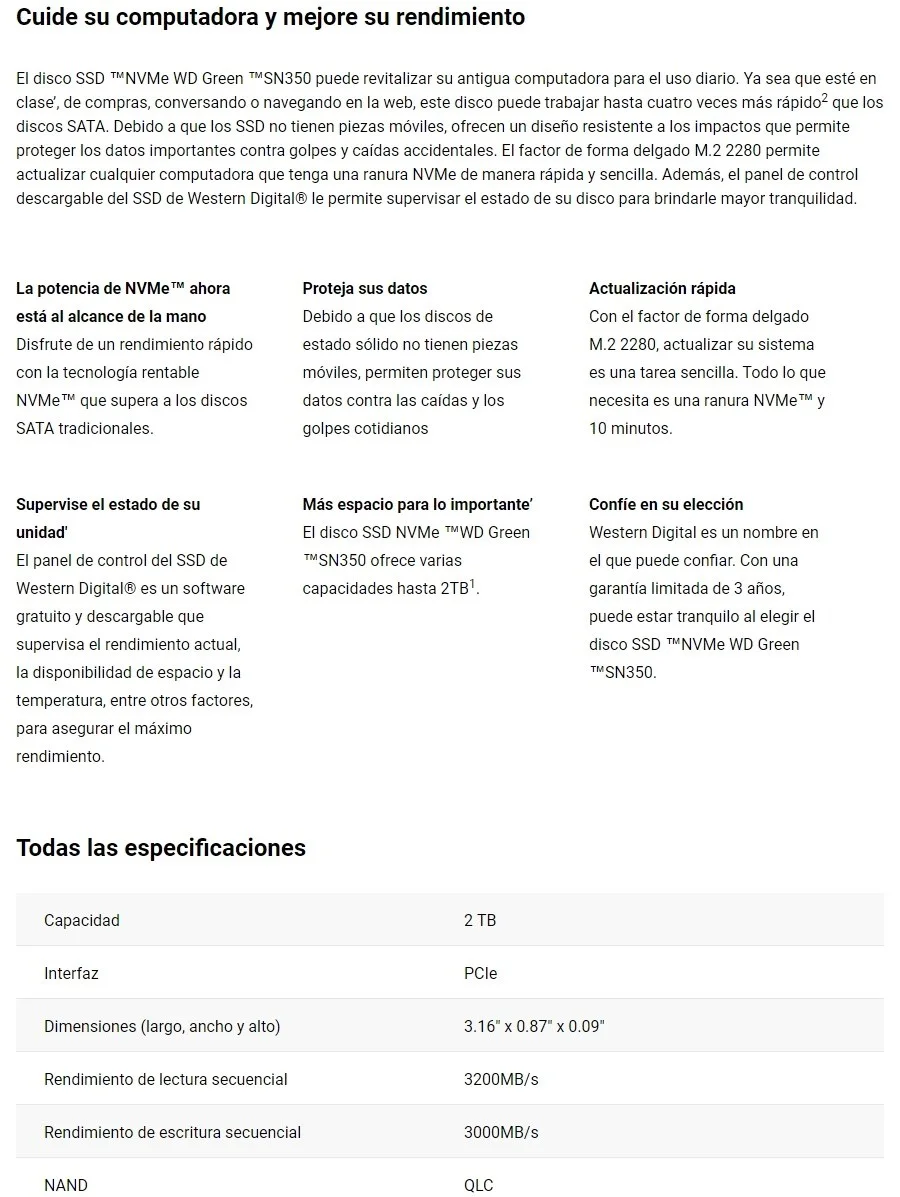 Unidad SSD M.2 NVME WD Green SN350 2TB WDS200T3G0C