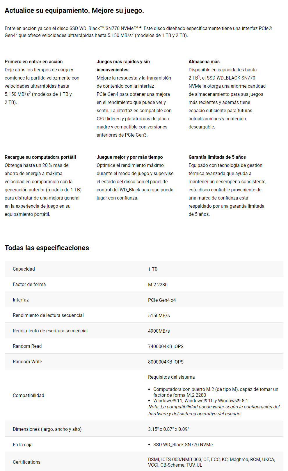Sé el primero en valorar “Unidad SSD M.2 NVME WESTERN DIGITAL BLACK SN770 / 1TB / 2280 / PCIe 4.0 / 3D NAND / Lectura 5150Mb/S, Escritura 4900 Mb/S”