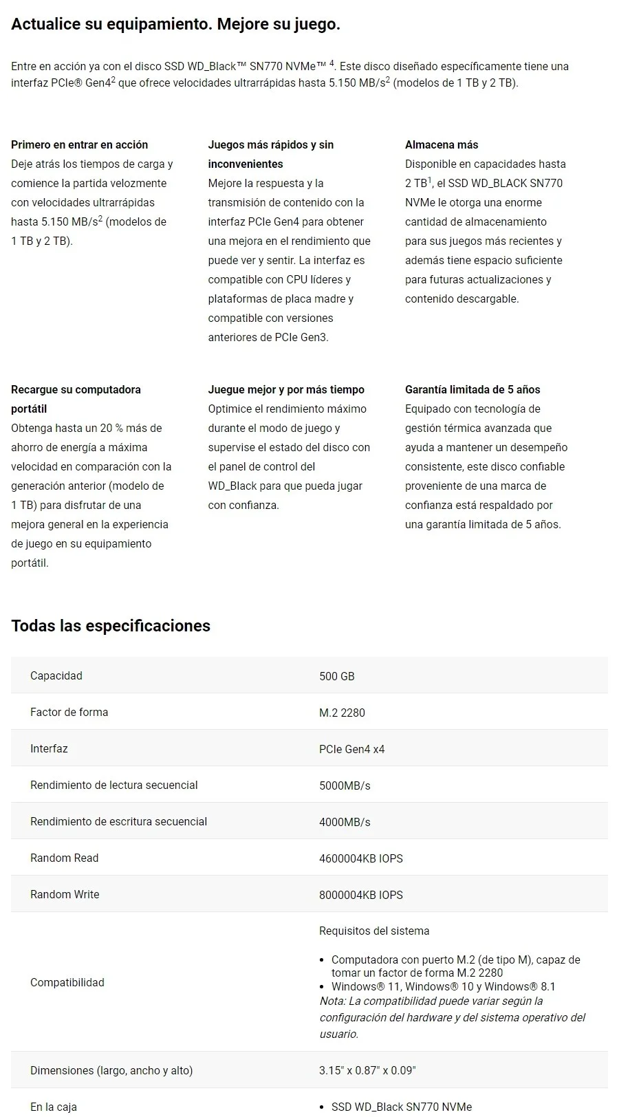 Unidad SSD M.2 NVME WESTERN DIGITAL WD BLACK SN770 500GB / PCIe 4.0 / 2280 / Lectura 5000MB/s / Escritura 4000MB/seg / Color Negro