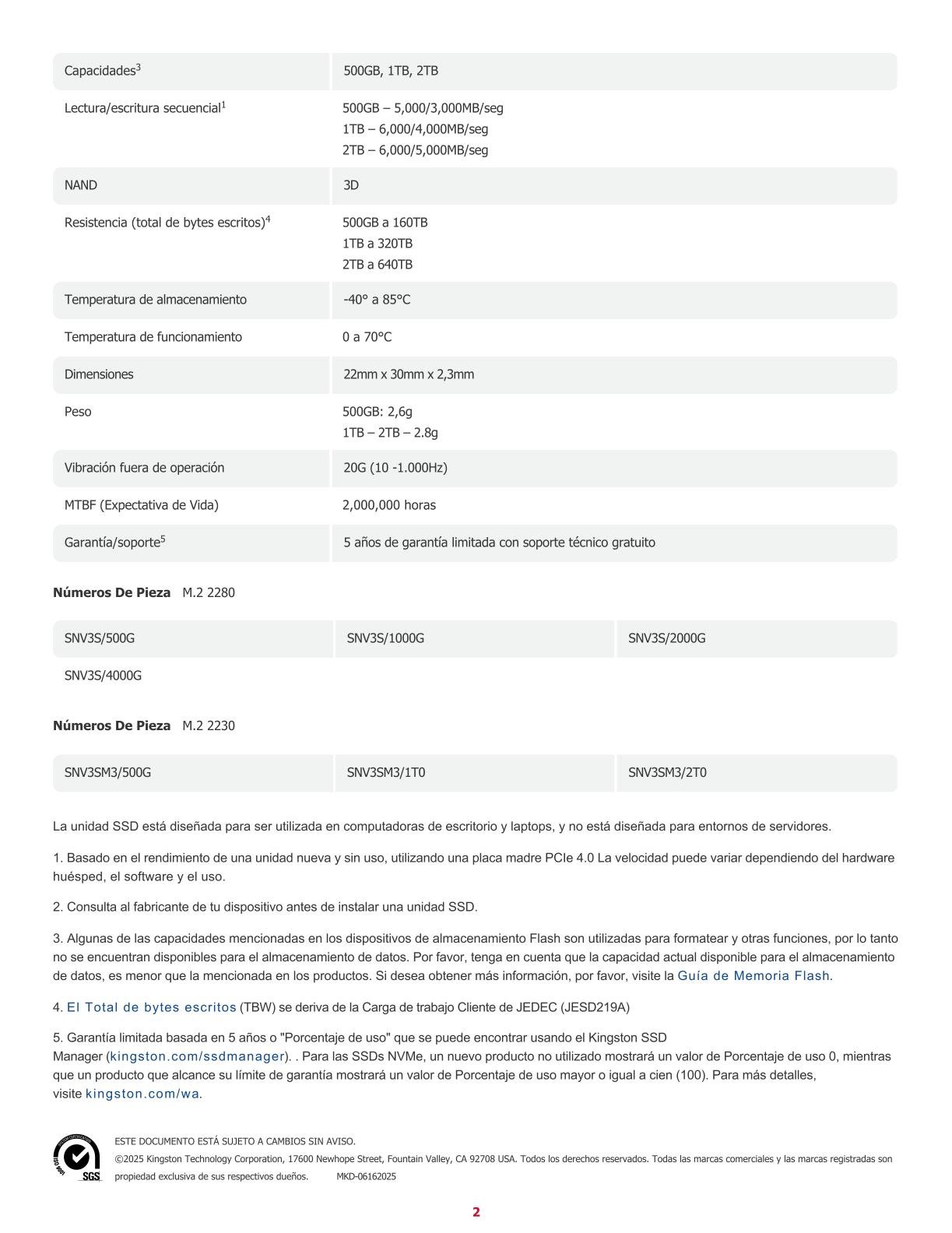 Unidad SSD NVMe Kingston SNV3SM3/2T0 2TB