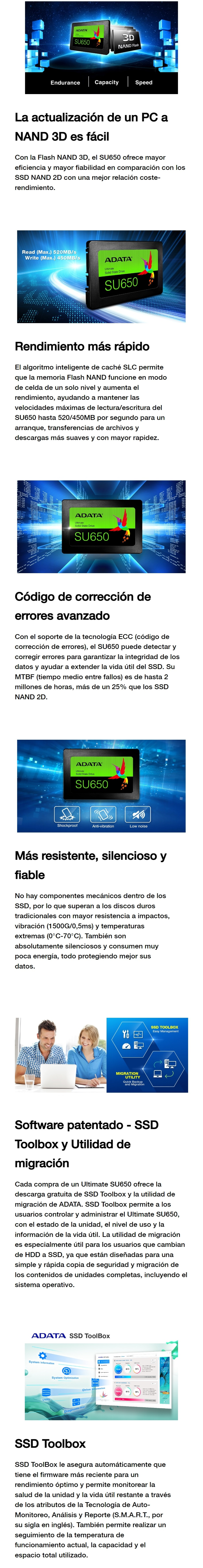 La unidad de estado sólido Ultimate SU650 implementa Flash NAND 3D y un controlador de alta velocidad, ofreciendo capacidades de hasta 960 GB.