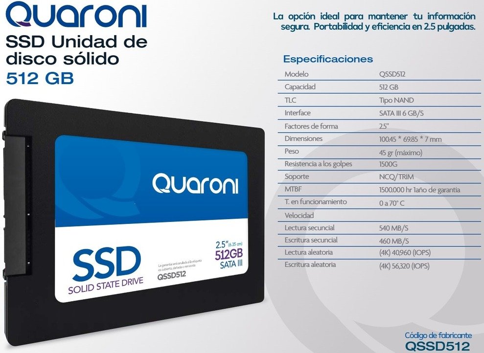 Maximiza el rendimiento con el SSD Quaroni 2.5 512GB SATA3, con lectura de 540MB/s y escritura de 460MB/s. Compra ahora en Tienda Ghia para una actualización rápida.