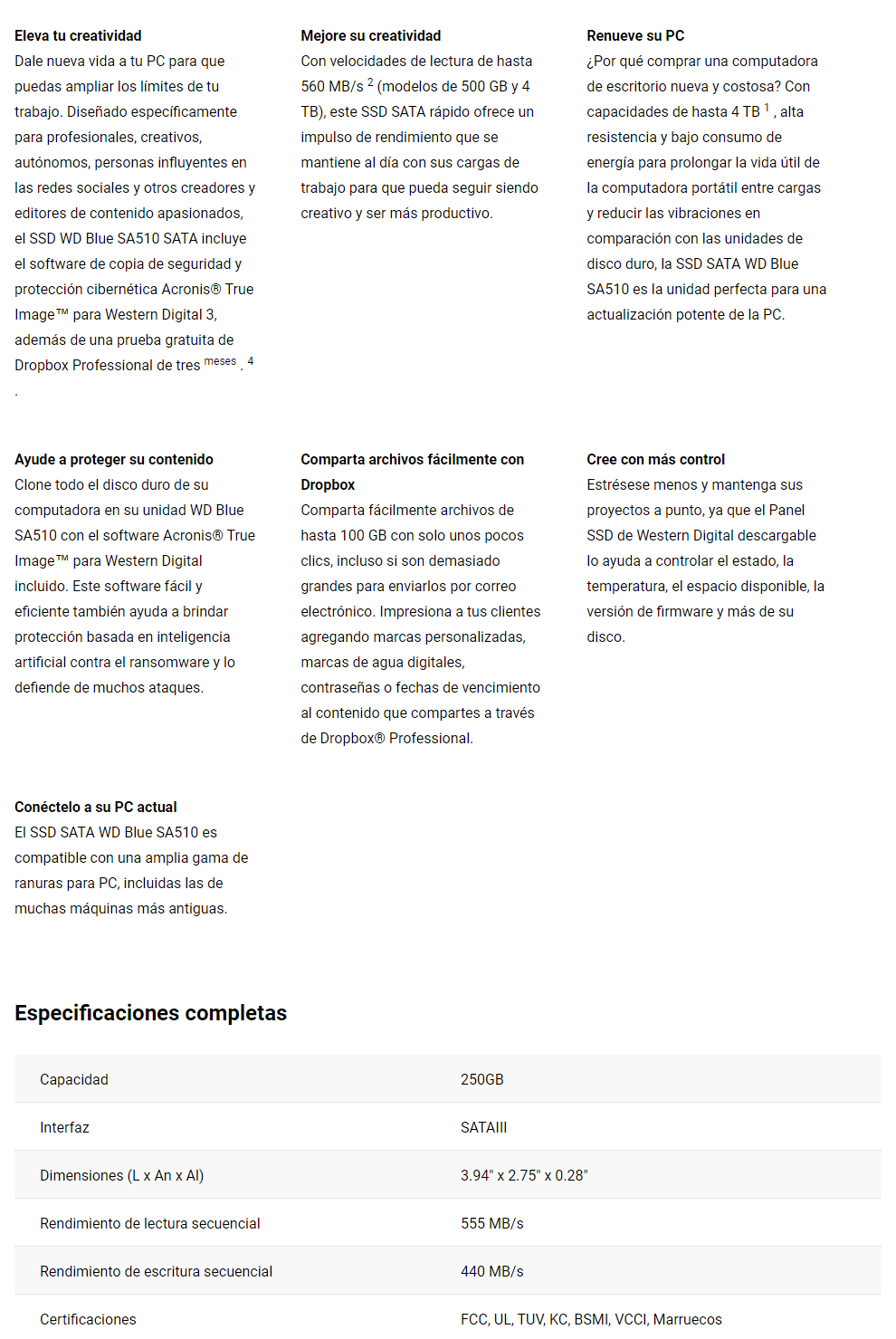 Sé el primero en valorar “Unidad De Estado Solido SSD WESTERN DIGITAL BLUE SA510 / 250GB / Sata III / Lectura 555Mb/s, Escritura 440Mb/s / 7mm / 2.5””