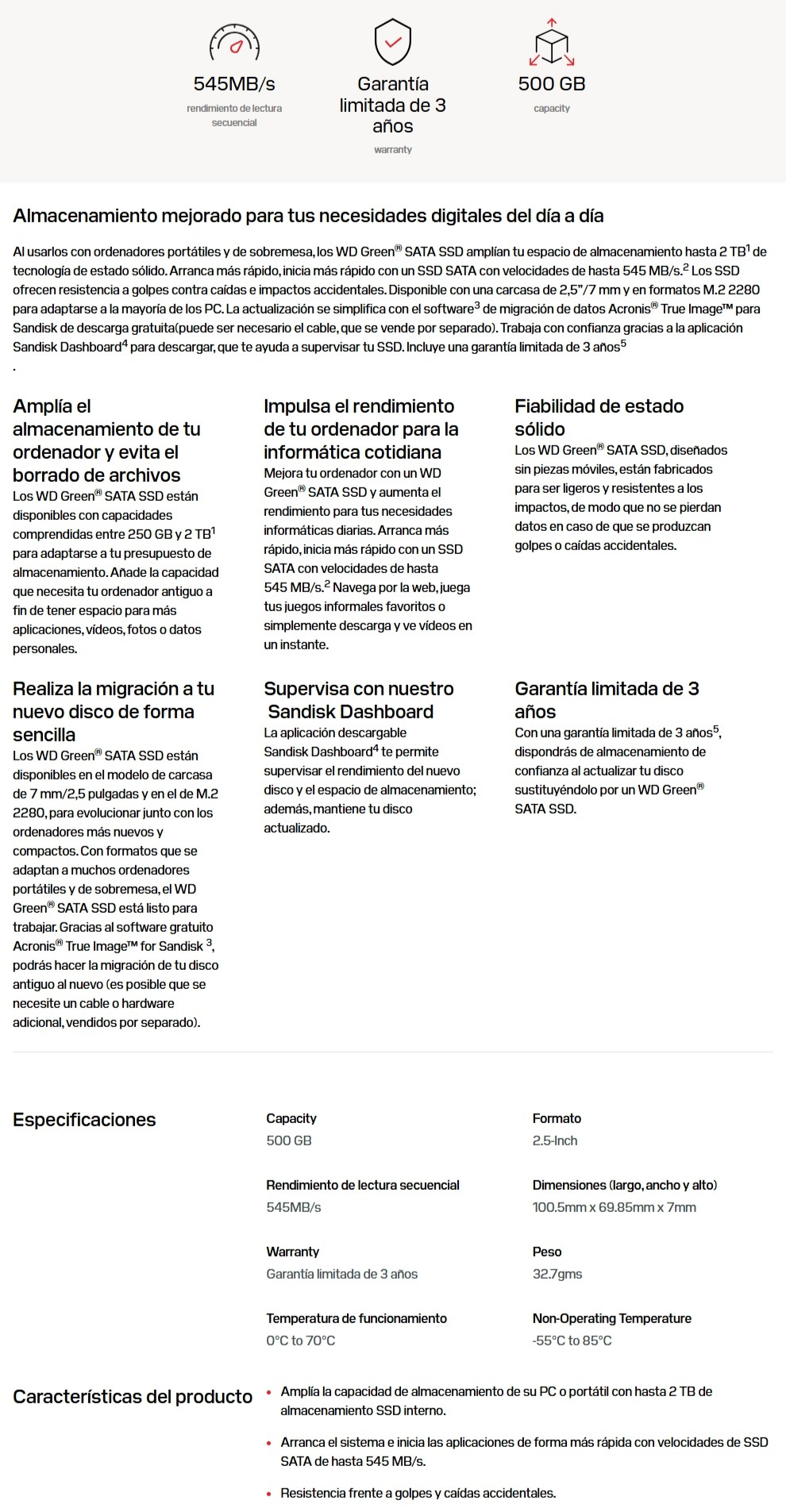 Unidad De Estado Solido SSD WESTERN DIGITAL GREEN – 500GB, SATA III, 2.5″, Lectura 545 MB/s