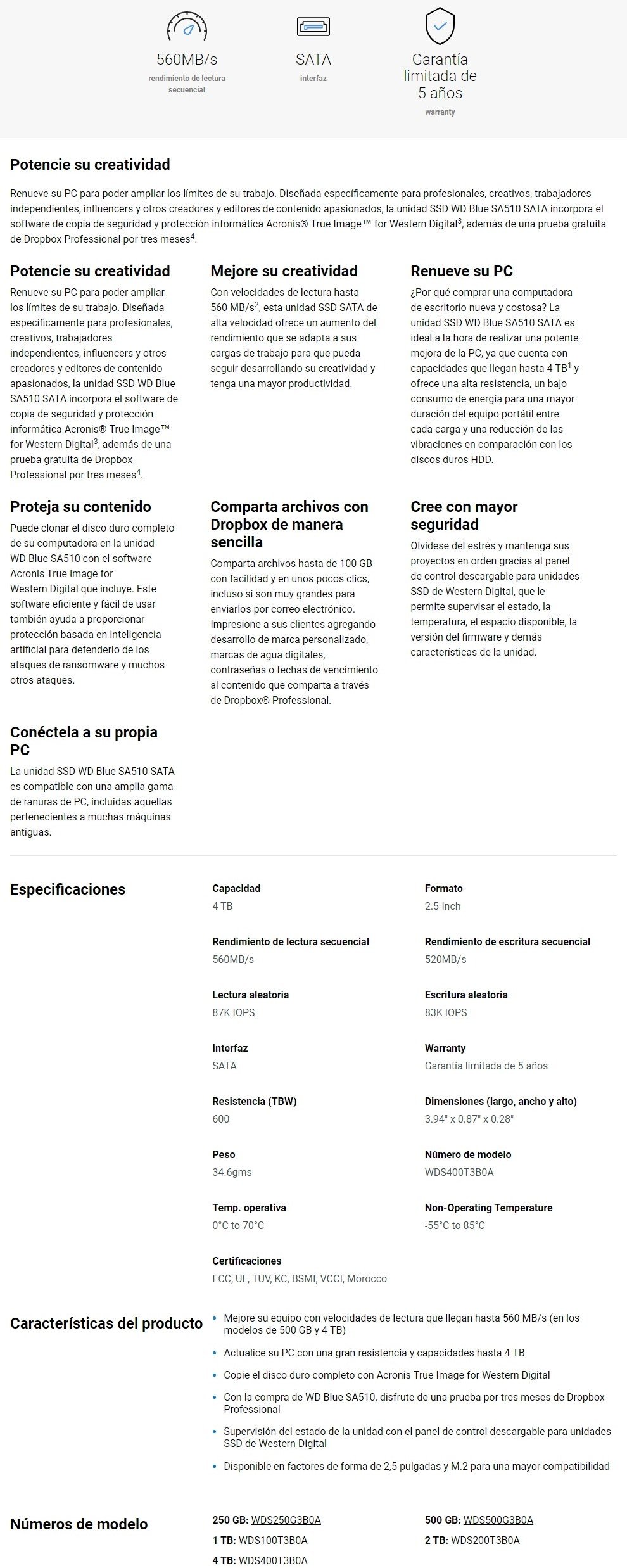 Unidad De Estado Solido SSD Western Digital WD Blue SA510 4TB / 2.5″ / SATA III 6Gb/s / Lectura 560MB/s / Escritura 520MB/s / FCC, UL, TUV, KC, BSMI, VCCI, Morocco