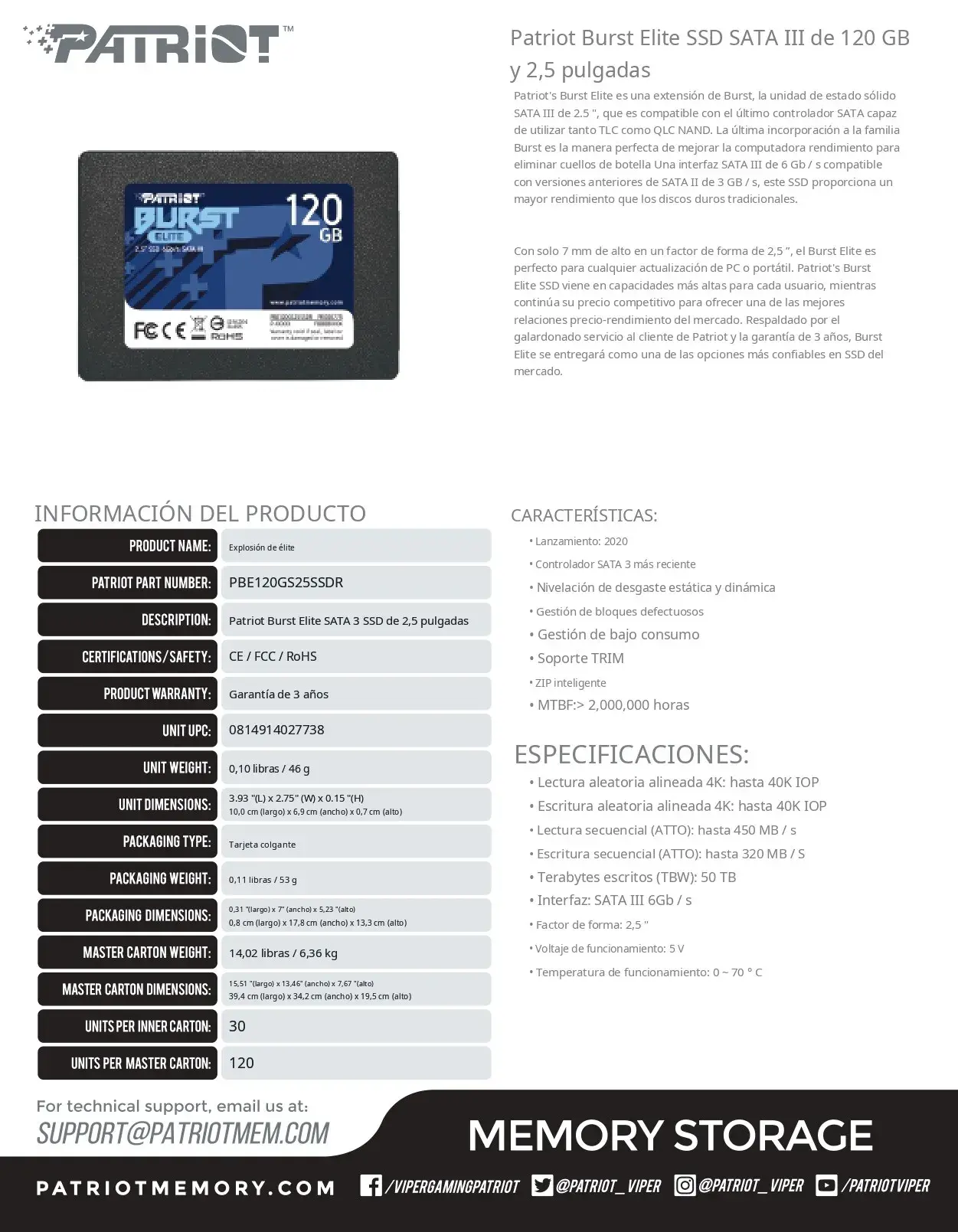 Sé el primero en valorar “Unidad SSD Patriot Burst / 120GB / 2.5″ / SATA III / 7MM / 3D Nand / Lectura 450MB/S, Escritura 320MB/S”