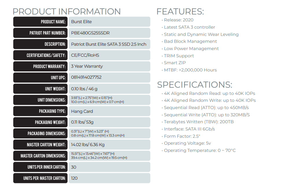 La unidad de estado sólido Patriot Burst es la manera perfecta de mejorar el rendimiento de su computadora. El Burst ofrece velocidades de transferencia rápidas para acelerar la carga de aplicaciones y proporcionar una mejor experiencia de juego en general.