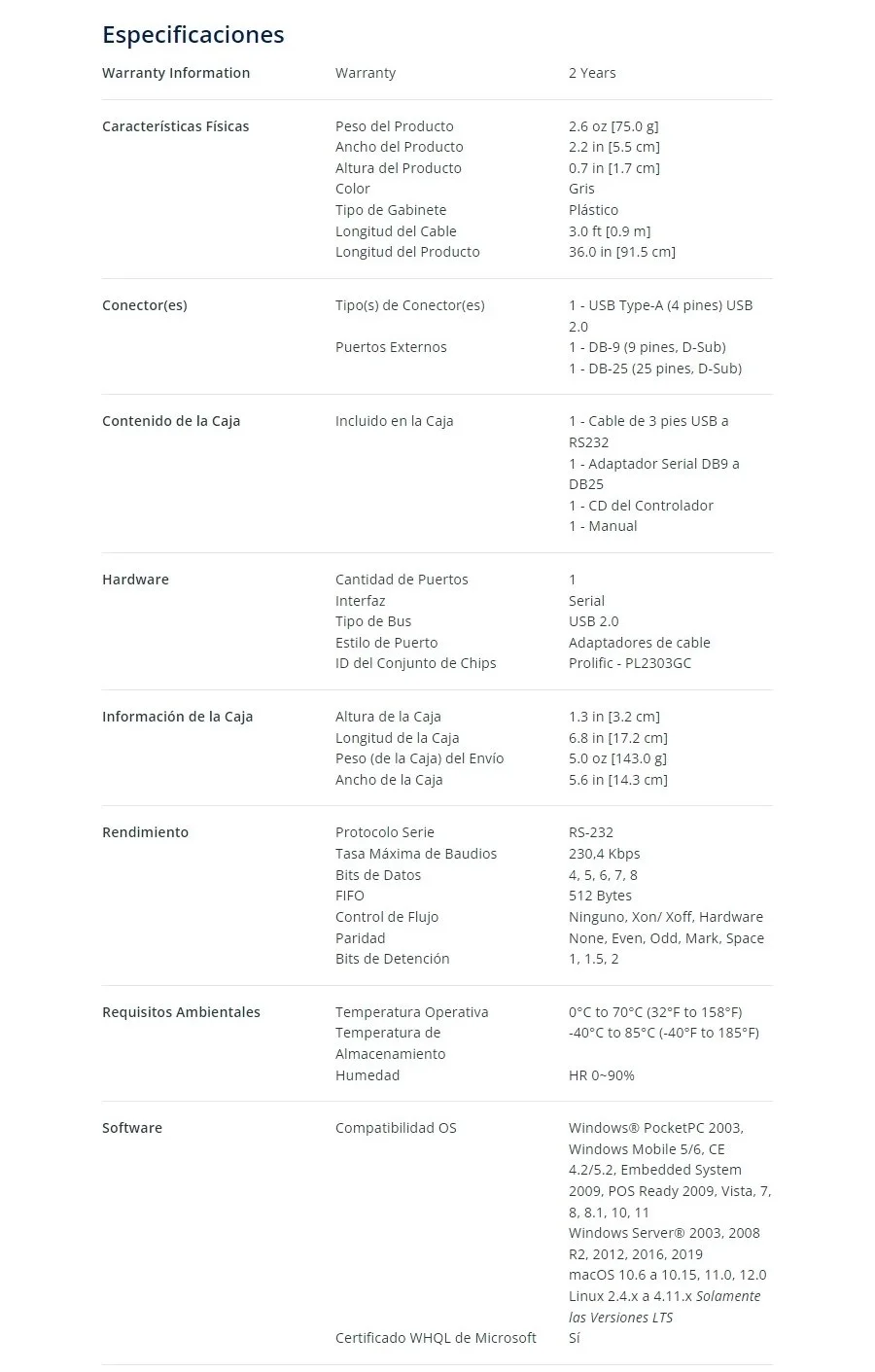 • Incluye un adaptador de pines DB9 a DB25 para una comunicación serie RS232 de 25 pines