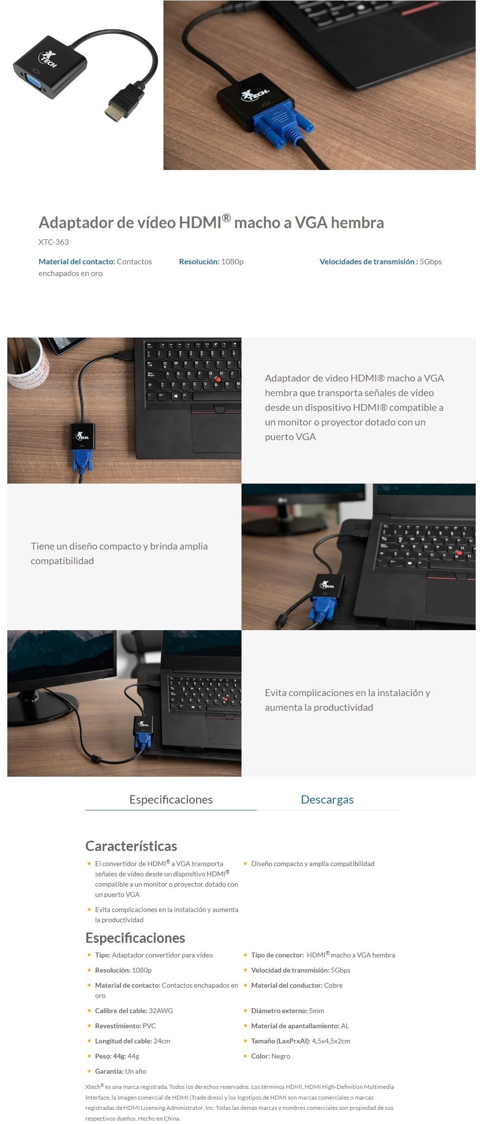 Cable Convertidor XTech XTC-363 / HDMI® Macho A VGA Hembra / Para Monitor O Proyector / Negro