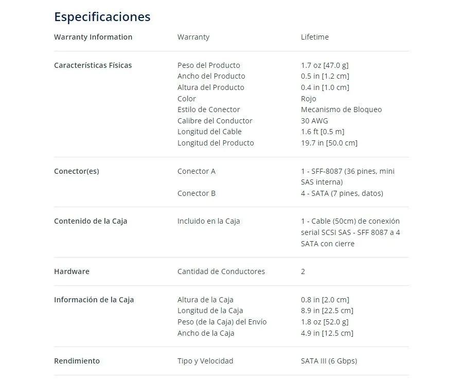 Adaptador Startech SAS8087S450 / Mini-SAS A SATA x4 / 6 Gbps / 50cm / Rojo