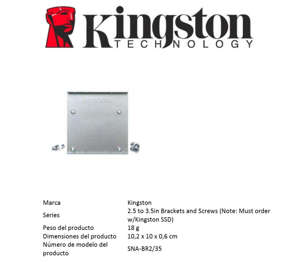 El modelo SNA-BR2/35 es compatible con todos los SSD de Kingston de 2.5”. El color del producto es plateado, lo que le brinda un aspecto elegante y moderno al equipo donde se instale.