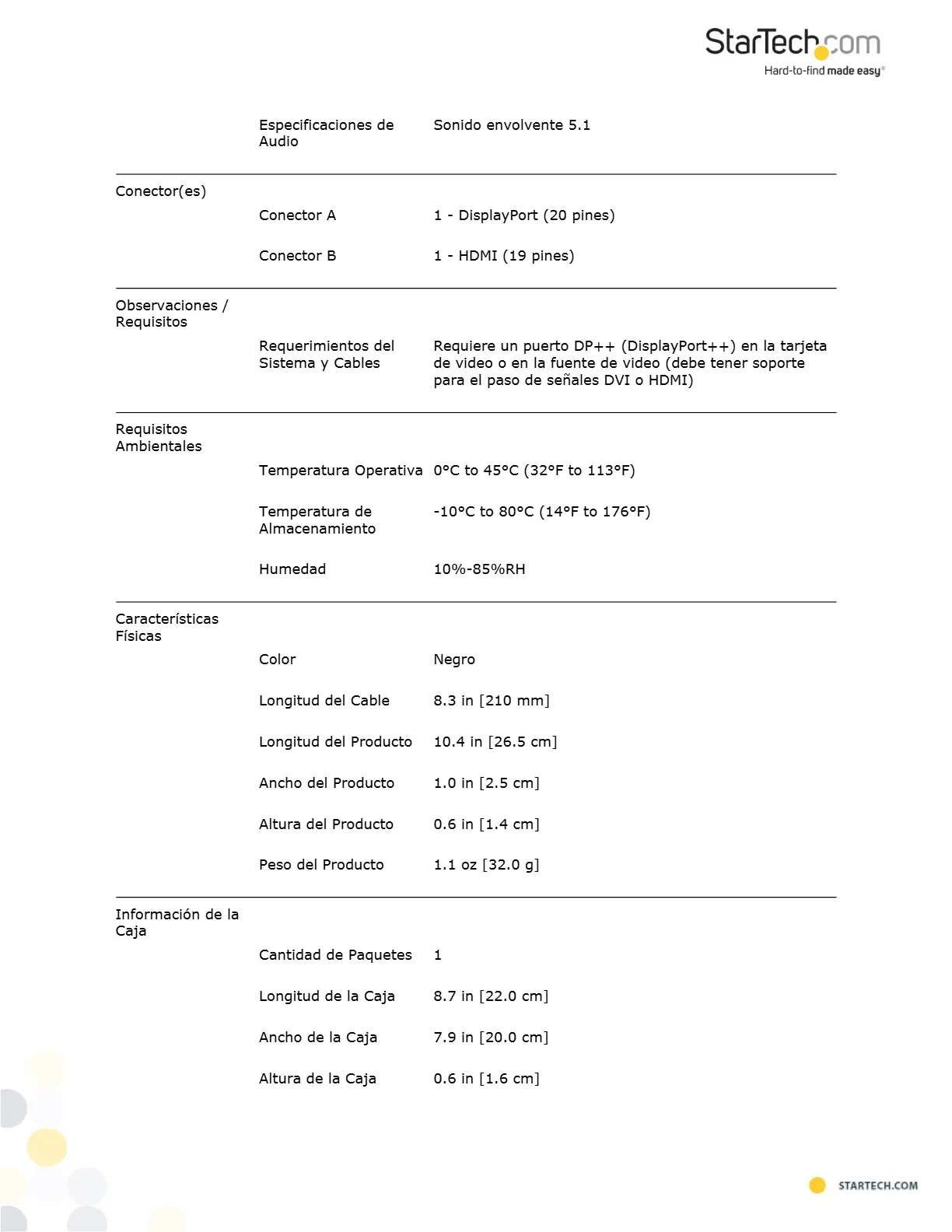 Sé el primero en valorar “Adaptador De Video StarTech.com / DisplayPort A HDMI / Cable DP Pasivo Hembra / HDMI Macho / DP 1920X1200 / Color Negro”