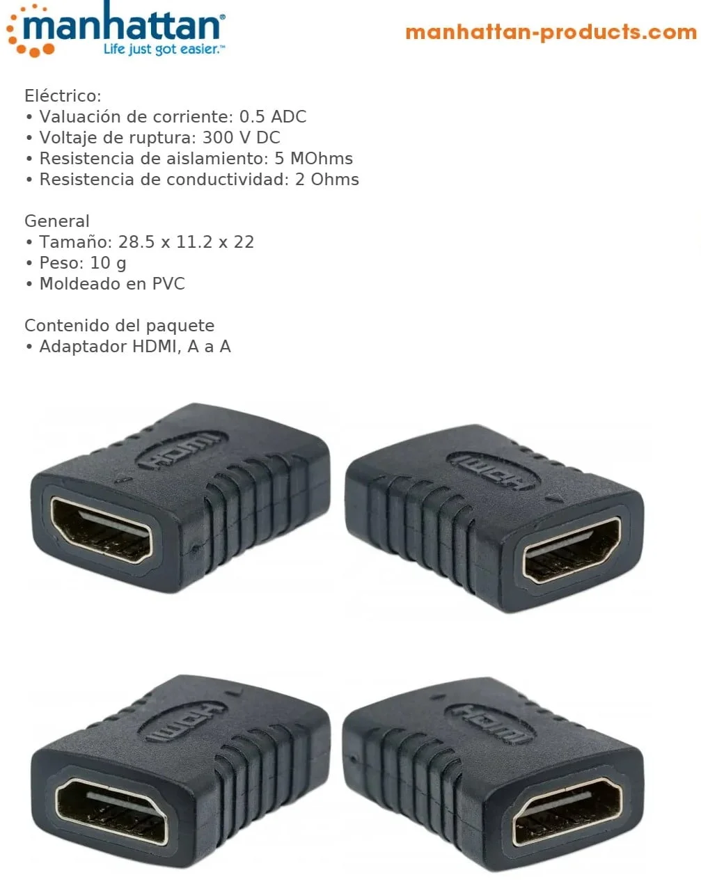 Conecta fácilmente dos cables HDMI para trabajar sobre largas distancias. El adaptador HDMI Manhattan es ideal para unir dos cables HDMI para dar longitud adicional a un cable de manera pasiva. Este Cople HDMI permite una resolución 4K y un ancho de banda de 10.2 Gbps a 340 MHz.