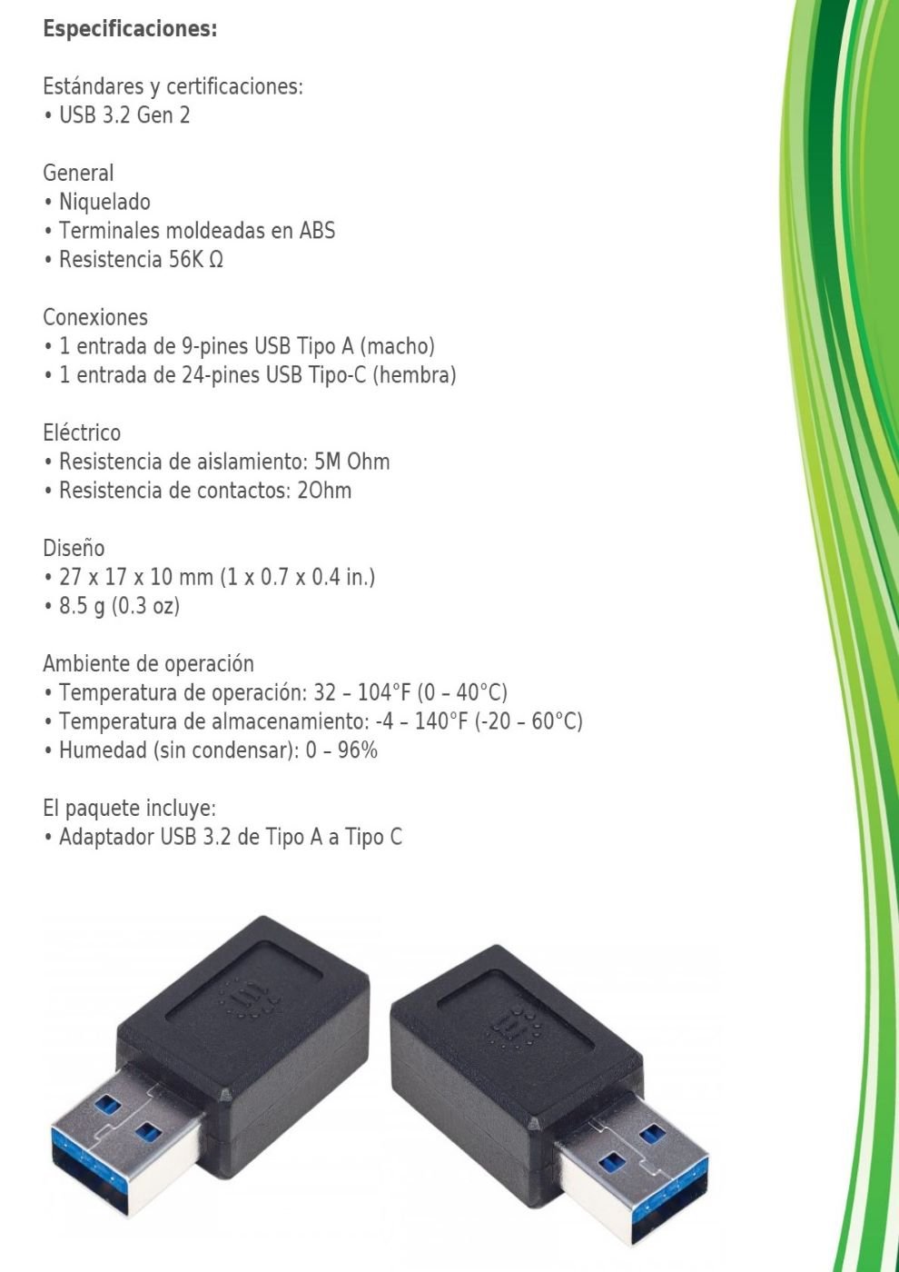 Adaptador USB MANHATTAN 354714 / USB-C A USB-A / USB 3.2 / Macho A Hembra / Portátil / 10 Gbps / Negro
