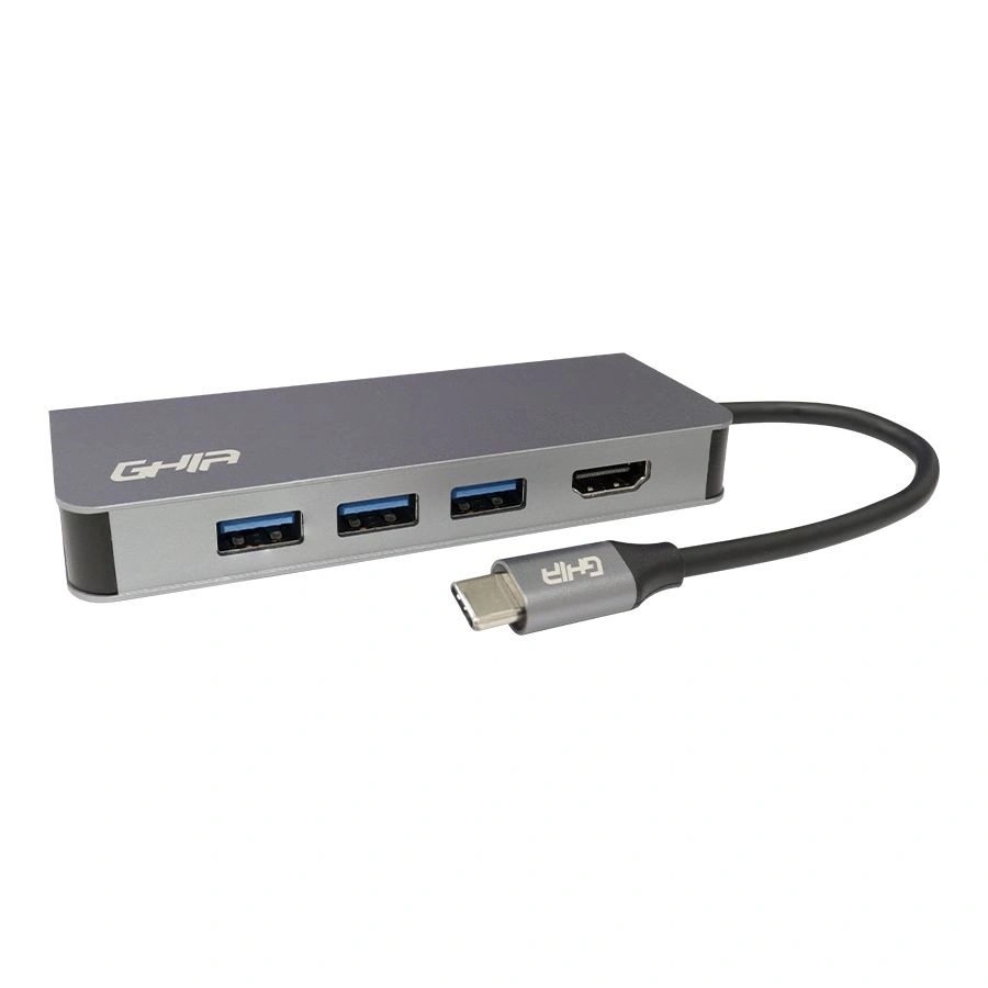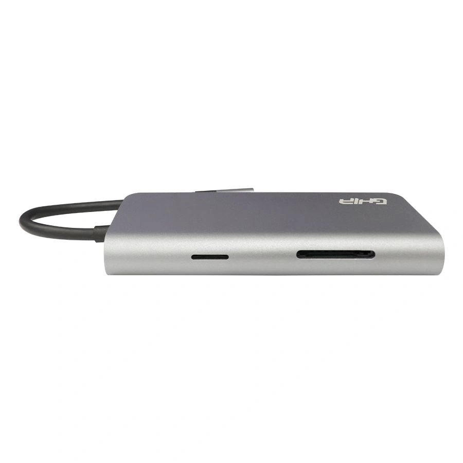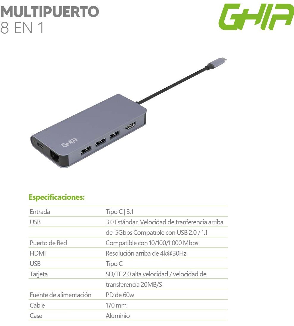 Cable Adaptador GHIA ADAP-20 / Multipuerto 8 En 1 / USB-A, HDMI, RJ45, USB-C, Micro SD, SD / Portátil / Gris