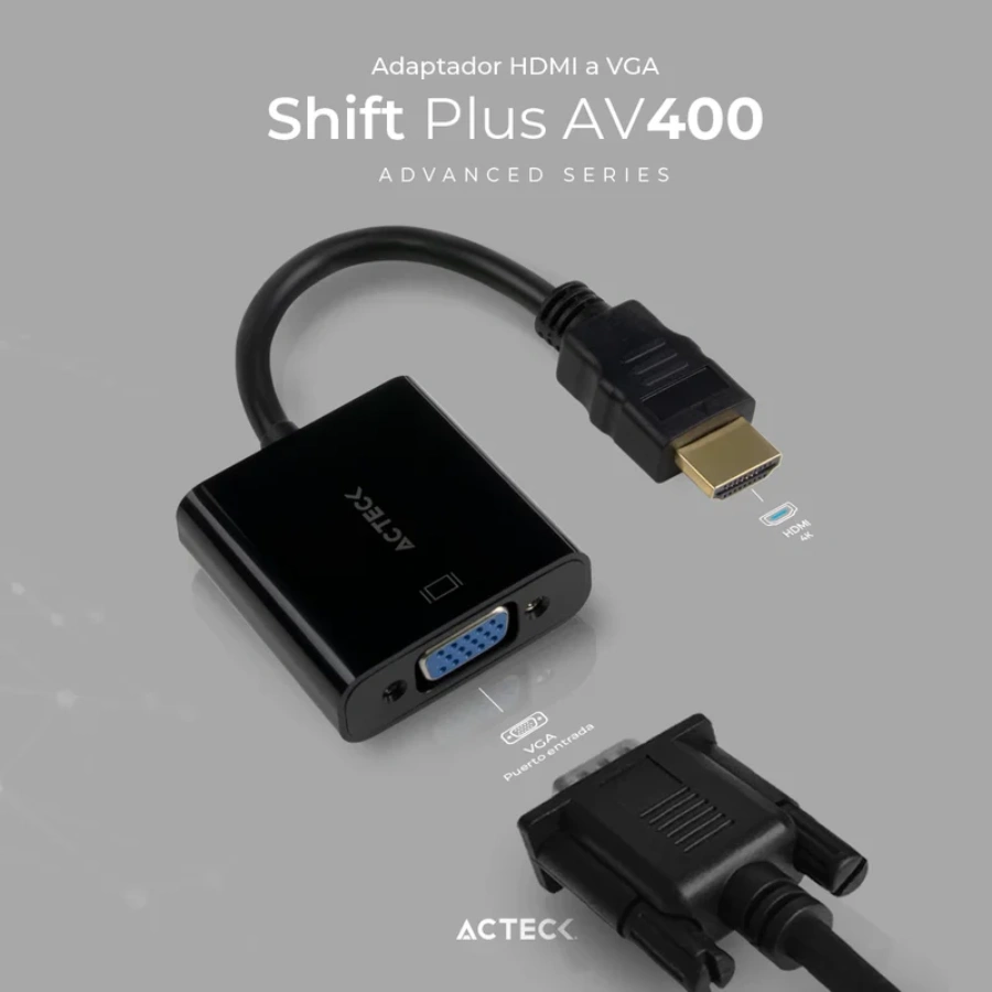 El Adaptador AV400 te permite convertir señales HDMI a VGA, brindándote la capacidad de conectar dispositivos modernos a pantallas más antiguas o no compatibles con HDMI.