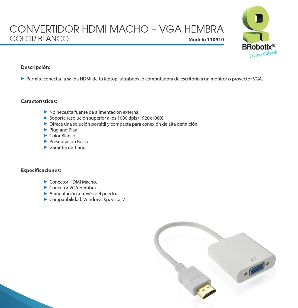 Cable Convertidor BROBOTIX 110910 / HDMI a VGA / Macho a Hembra / Blanco