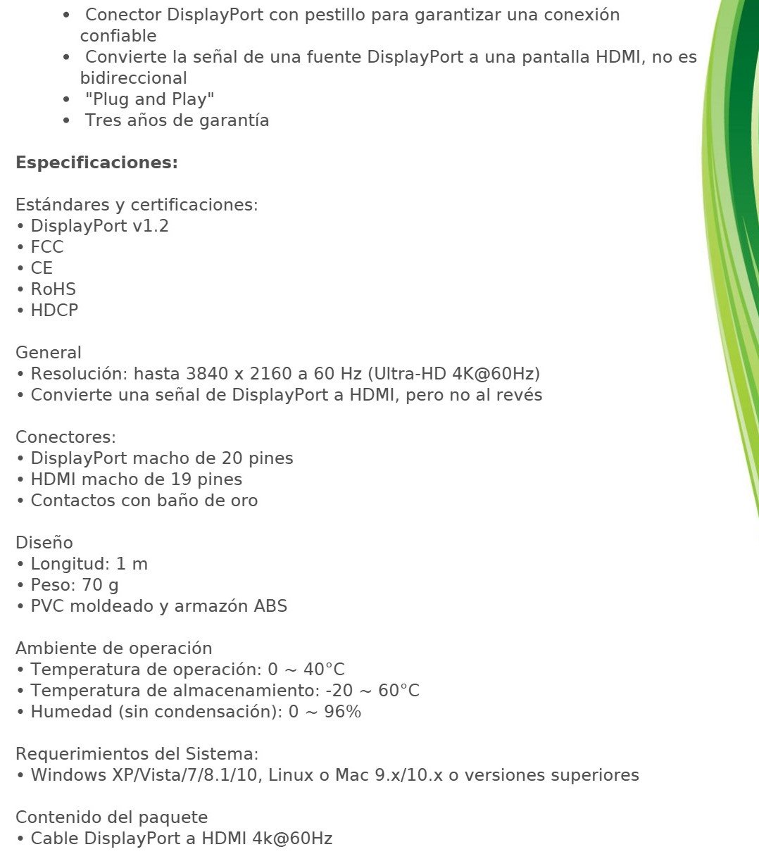 • Permite resoluciones de video Ultra-HD (UHD) hasta 4K@60Hz (3840 x 2160 a 60 Hz)