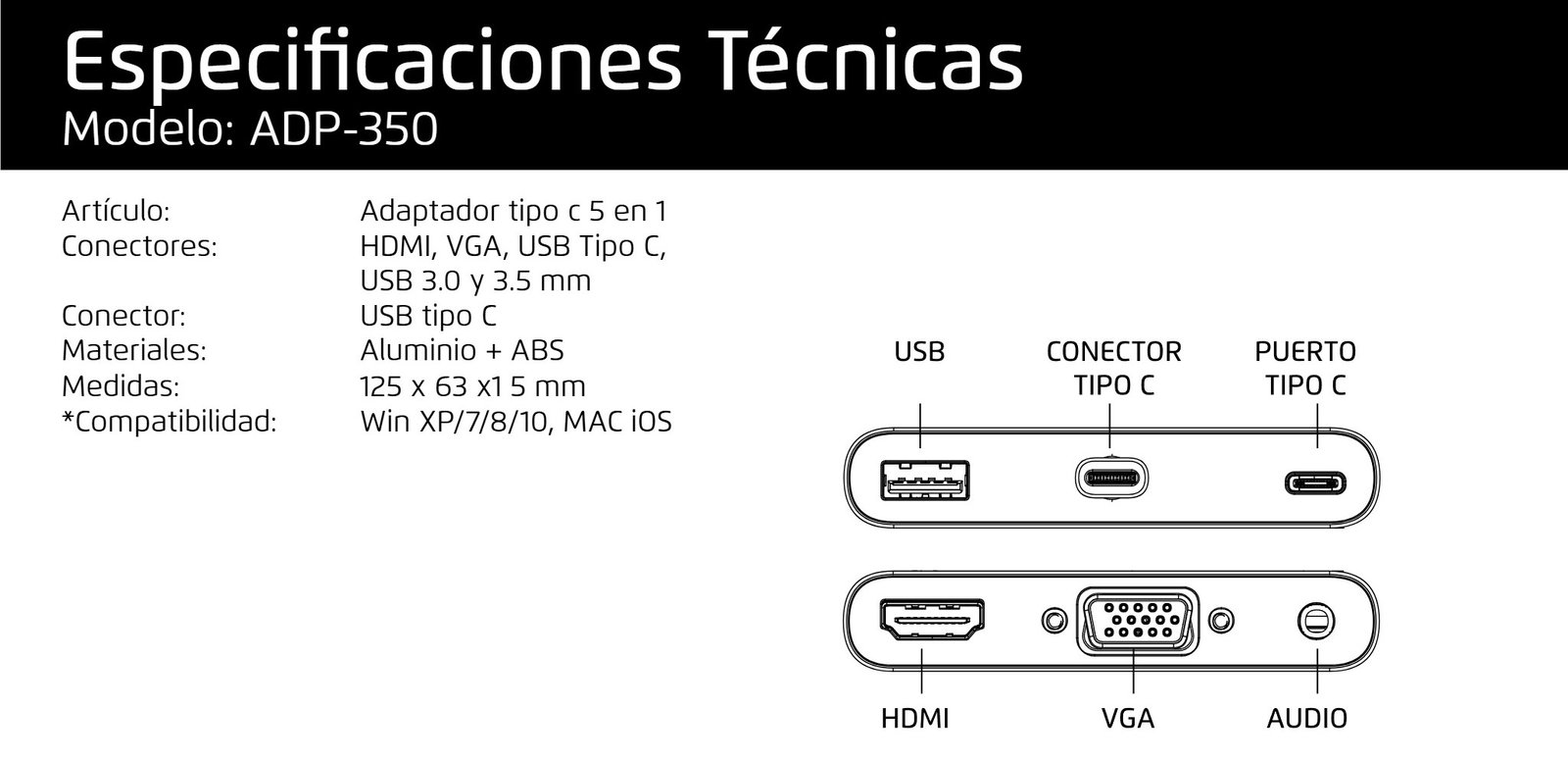 No dejes de utilizar tus periféricos y dispositivos sólo porque tu equipo no cuenta con todos los tipos de entradas que requieres. El adaptador cinco en uno ADP-350 de Vorago te permite conectar lo que desees de forma sencilla y portátil.